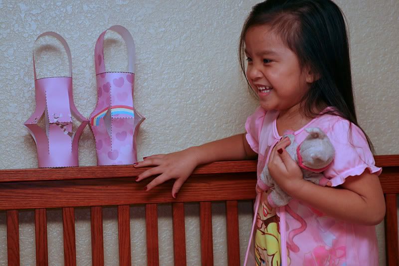 Kaia and I were up past midnight. Me because I was packing for my trip, and she just because I was up. Anyway, I let her play on the computer while I packed and she found a site on Nick Jr. and printed out some patterns for Chinese lanterns, which of course I had to cut and put together in the midst of my frantic packing.